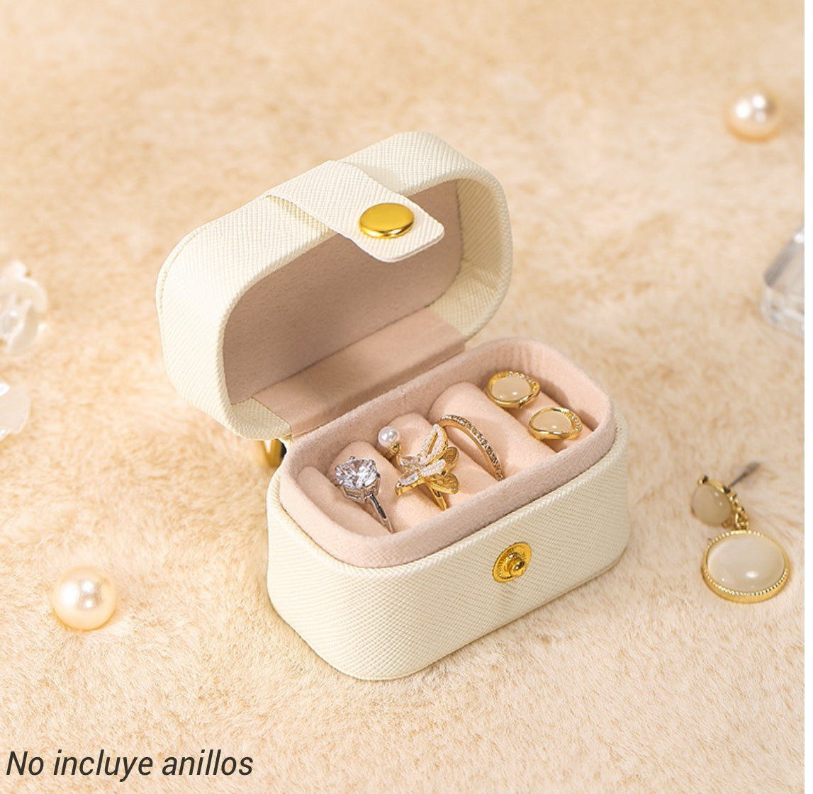 Este mini joyero blanco es ideal para organizar y proteger tus anillos o aros durante tus viajes. Su tamaño compacto facilita su transporte, mientras que su diseño funcional asegura que tus piezas favoritas se mantengan seguras y libres de daños. Perfecto para quienes buscan practicidad sin sacrificar estilo.