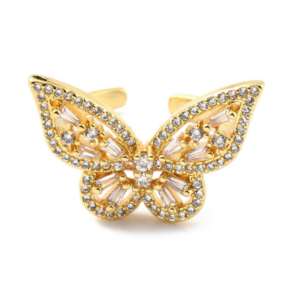 Este anillo elegante cuenta con una delicada mariposa adornada con microcirconias, y está chapado en oro 18k para un toque de sofisticación. Además, es ajustable para adaptarse a cualquier tamaño de dedo.