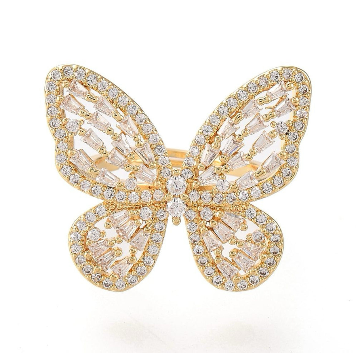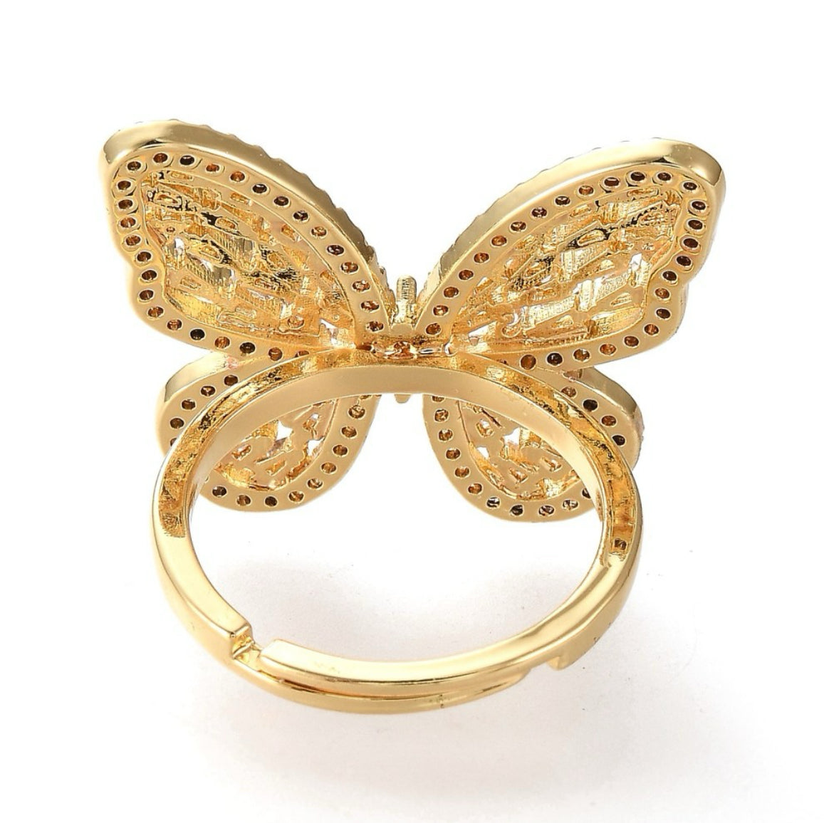 Este anillo elegante cuenta con una delicada mariposa adornada con microcirconias, y está chapado en oro 18k para un toque de sofisticación. Además, es ajustable para adaptarse a cualquier tamaño de dedo.