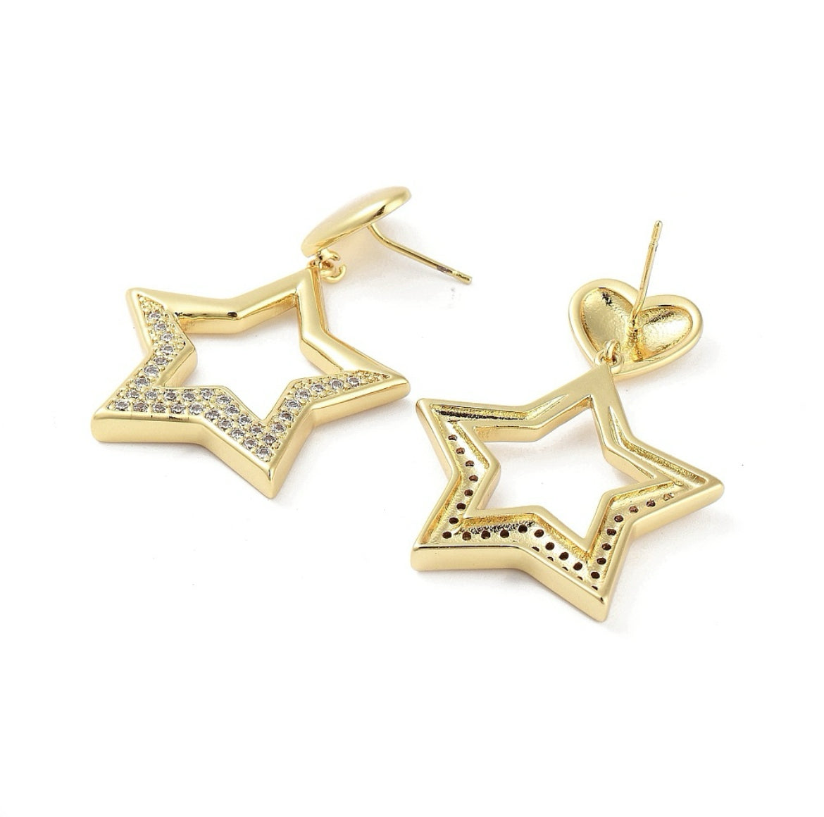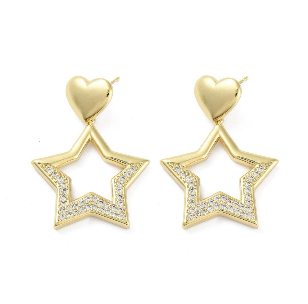 Estos aros AR09 cuentan con un elegante diseño de corazón y estrella, decorado con micro circonias y chapado en oro 18k. Realza tu estilo con este accesorio de alta calidad y brillo duradero. Ideal para cualquier ocasión, complemento perfecto para tu look de día o de noche.
